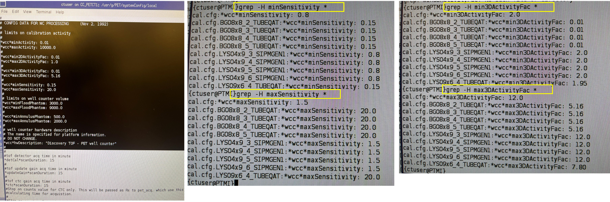 The console contains a collection of config files for different models and detector configurations. I grep'ped for a few of the above strings for Activity Correction Factor ranges, and have attached a picture of the output.
