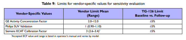 In AAPM TG 126, "PET/CT Acceptance Testing and Quality Assurance", in the Sensitivity section, there are a couple of methods and vendors described. There is a table that lists vendor ranges, but I'm not sure where these values come from. Does anyone know? I'm especially interested in GE.