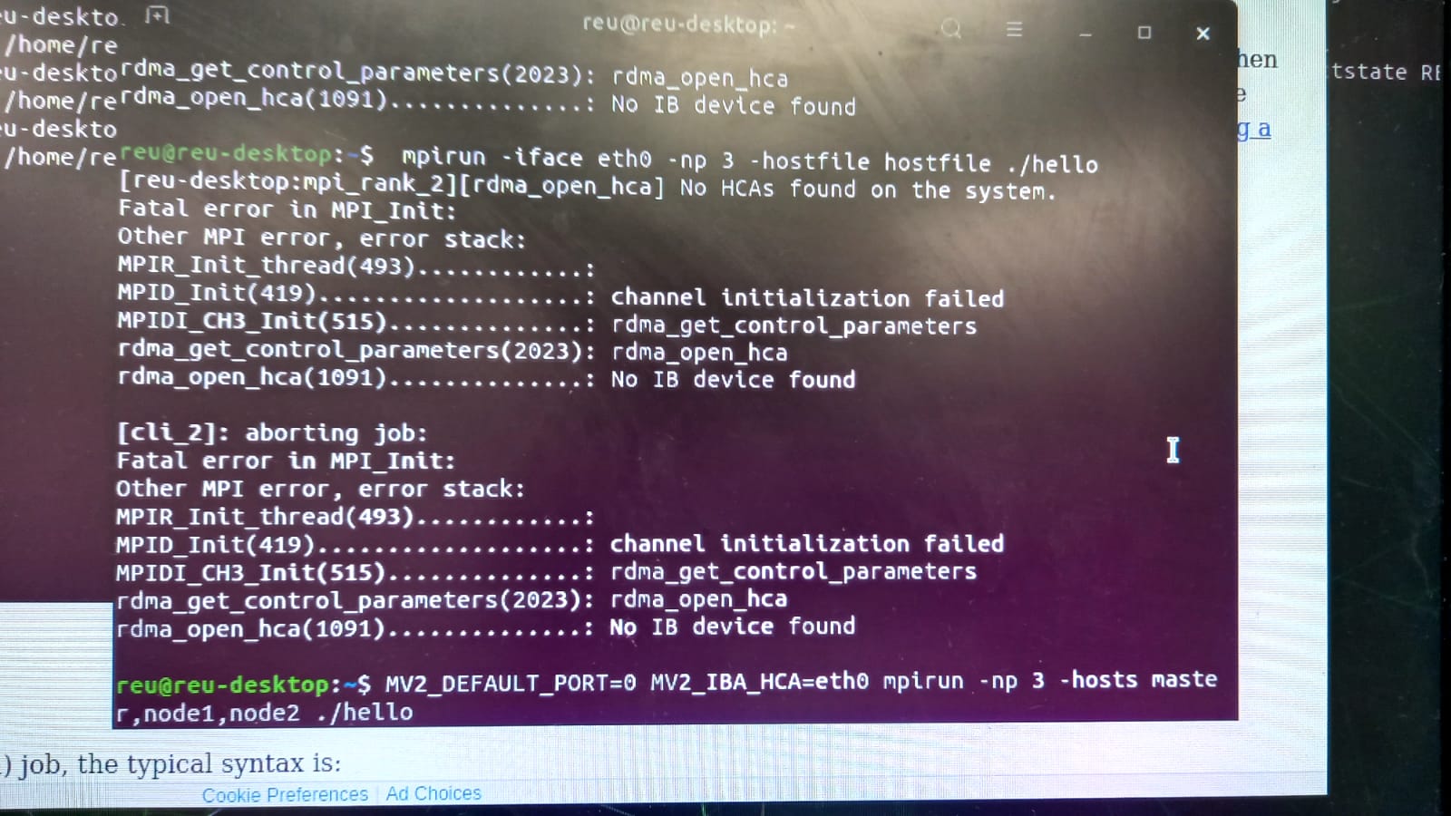 Nice to meet you guys. I am currently building a cluster with 2 slave nodes of jetson nano and 1 master node of jetson orin connected with ethernet. I have verified the passwordless ssh and all the connections, all the devices ip have been set properly. The version of mvapich2 is 2.3.7. When I run "mpirun -np 3 -hostfile hostfile ./hello", I will face an error with no HCAs found and lead to an aborting job. Even if I set -iface to pick a specific interface eth0, it still just out this problem. I have tried "MV2_IBA_HCA=eth0 MV2_DEFAULT_PORT=0" and some other way to jump out the HCAs and IB, but non of them are working, do you have some idea about how to solve this problem?