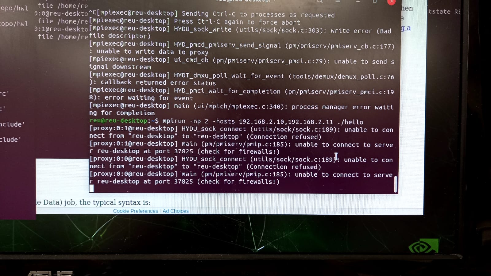 Also, if I try to do "mpirun -np 2 -hosts 192.168.2.10,192.168.2.11(ip for two node) /home/reu/hello" , I will also face some problem and ask me to check the firewall, which is different port each time, I am also need some help with it.